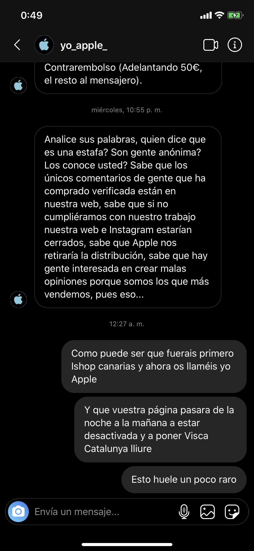 Buenas noches a todos lo primero de todo deciros que no se os ocurra comprar nada en esa página, no tengo pruebas al 100 por cien que demuestre que sea una estafa, porque eso solo lo puede dictaminar la Justicia pero después de haber estado mucho tiempo analizando esta tienda y haber sido casi víctima de estafa esta tienda online llamada Yo Apple, que antes se llamaba Ishop Canarias y anteriormente Ishop os diría que ni se os ocurra, esta tienda no hay manera de pillarla por ningún lado, hace tiempo bueno, hace 6 meses exactamente cuando se llamaban Ishop Canarias, les pregunte por la empresa y su CIF,( Actualmente el CIF que tiene yo apple en su página web si lo buscáis veréis que no tiene nada que ver con esa empresa) bueno como iba contando quería informarme sobre la empresa y esto podéis comprobarlo por vosotros mismos, a la hora de pagar por transferencia aparece una cuenta de Lituania para mandar el dinero, igual que en Ishop canarias, ( Método que una vez que mandéis el dinero no hay manera de que vuelva) la sede social está en Reino Unido y está registrada en el registro mercantil de Gran canaria y el almacén lo tienen en Barcelona, por que decir que no aparece en ningún sitio información de esa empresa, ni en los informes del registro Mercantil, ni en ninguna página como Expansión, Infojobs U otras páginas especializadas en informes de empresa y también es un poco raro que después de haberles dicho todo esto, me bloquearan, el resumen que cada uno haga lo que quiera, pero deciros que luego no reclaméis el dinero porque con la ingeniería Contable y Jurídica que tienen montada es imposible y porque decir que en unos meses la página desaparecerá.... porque decir que la gente que esté leyendo esto y haya conocido Ishop canarias y se meta a Yo Apple, en el apartado de política de privacidad y términos de servicio veréis que es un copia y pega de su antigua página ( Ishop Canarias), os djunto una imagen de la conversación donde muestra cómo les he sacado el tema y en unos segundos me han bloqueado sin más, postura un poco sospechoso de alguien que supuestamente no tiene nada que esconder ni temer.