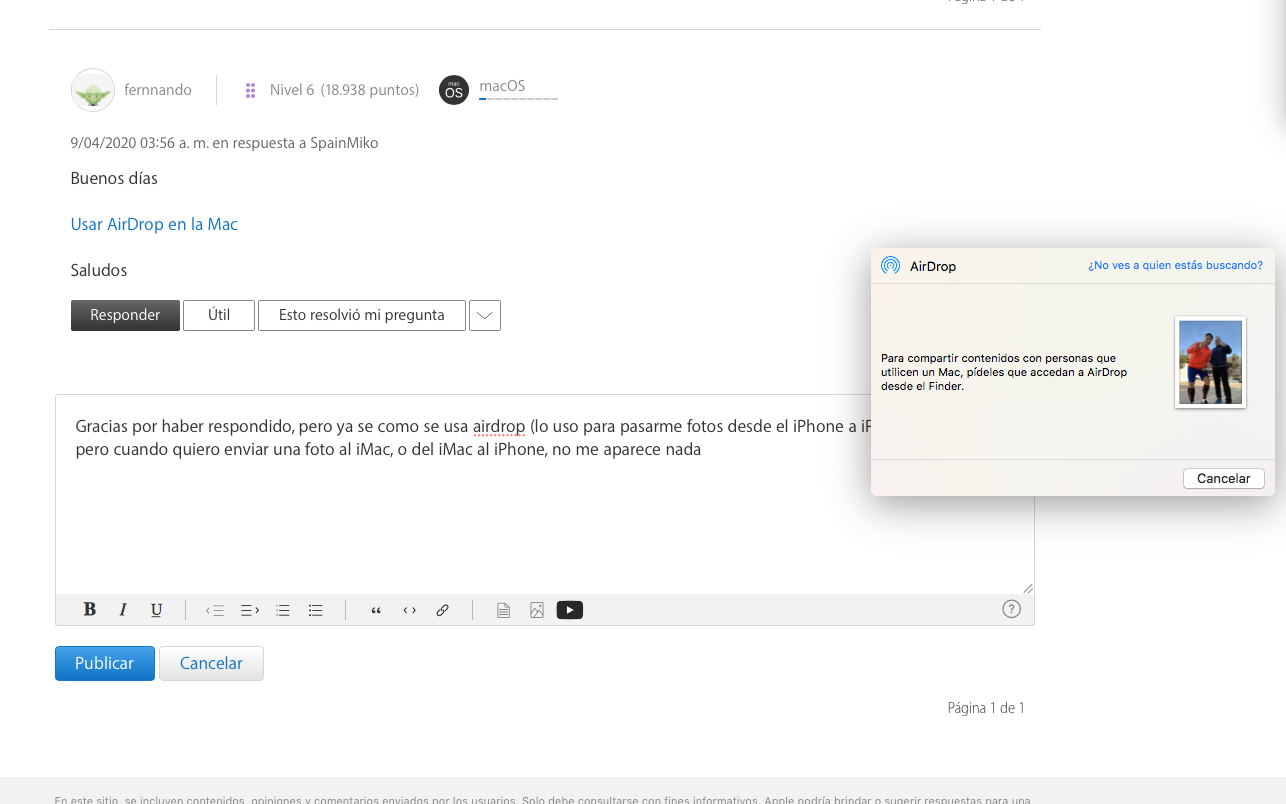 Gracias por haber respondido, pero ya se como se usa airdrop (lo uso para pasarme fotos desde el iPhone a iPad y viceversa), pero cuando quiero enviar una foto al iMac, o del iMac al iPhone, no me aparece nada