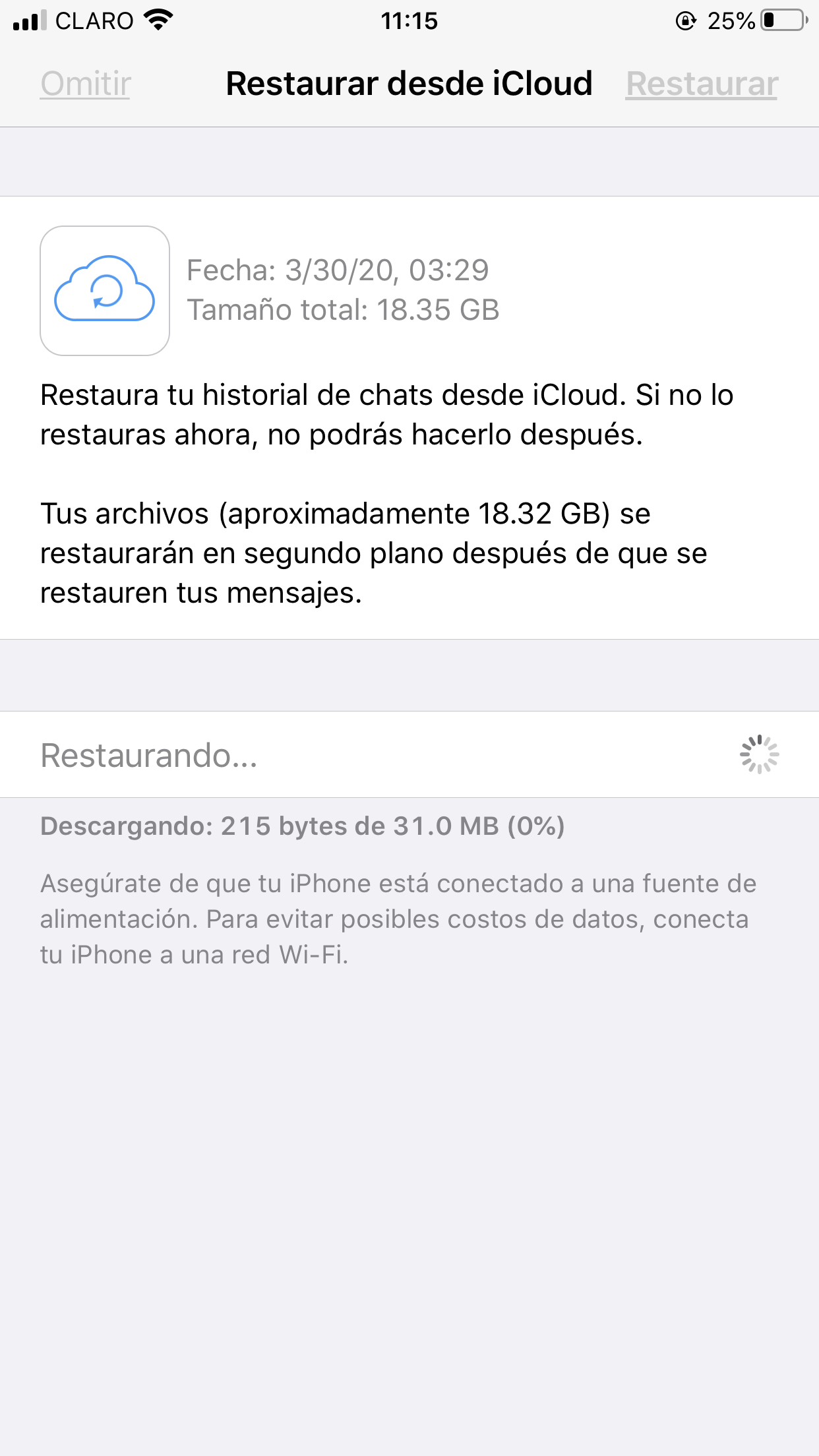 Tuve que resetear mi iphone porque no me acordaba del Pin, como tenia copia de seguridad recupere todo, a excepción de Whatsapp. Esa app no se me pude terminar de instalar, así que la elimine y la volví a instalar, en el proceso puse restaurar mis conversaciones. tengo la copia de seguridad, siempre he tenido espacio. mi copia pesa 18.35 gb.