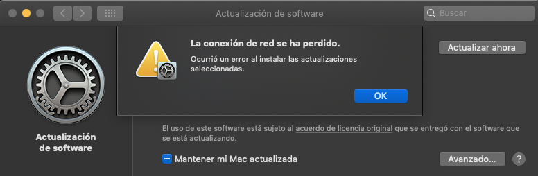 Tengo la Versión Mojave, y he tratado de instala una actualización de seguridad, pero en todos los intentos se bloquea diciendo que se pierde comunicación Anexo captura de pantalla, espero me puedan ayudar. Saludos