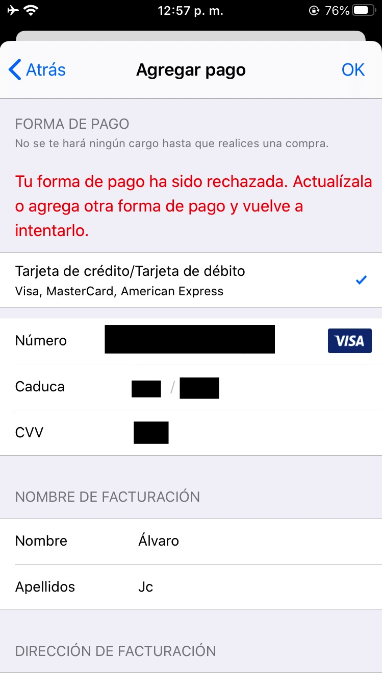 La información de pago no pudo ser actualizada. Tu método de pago ha sido rechazado. Por favor, ingresa la información de un método de pago válido.