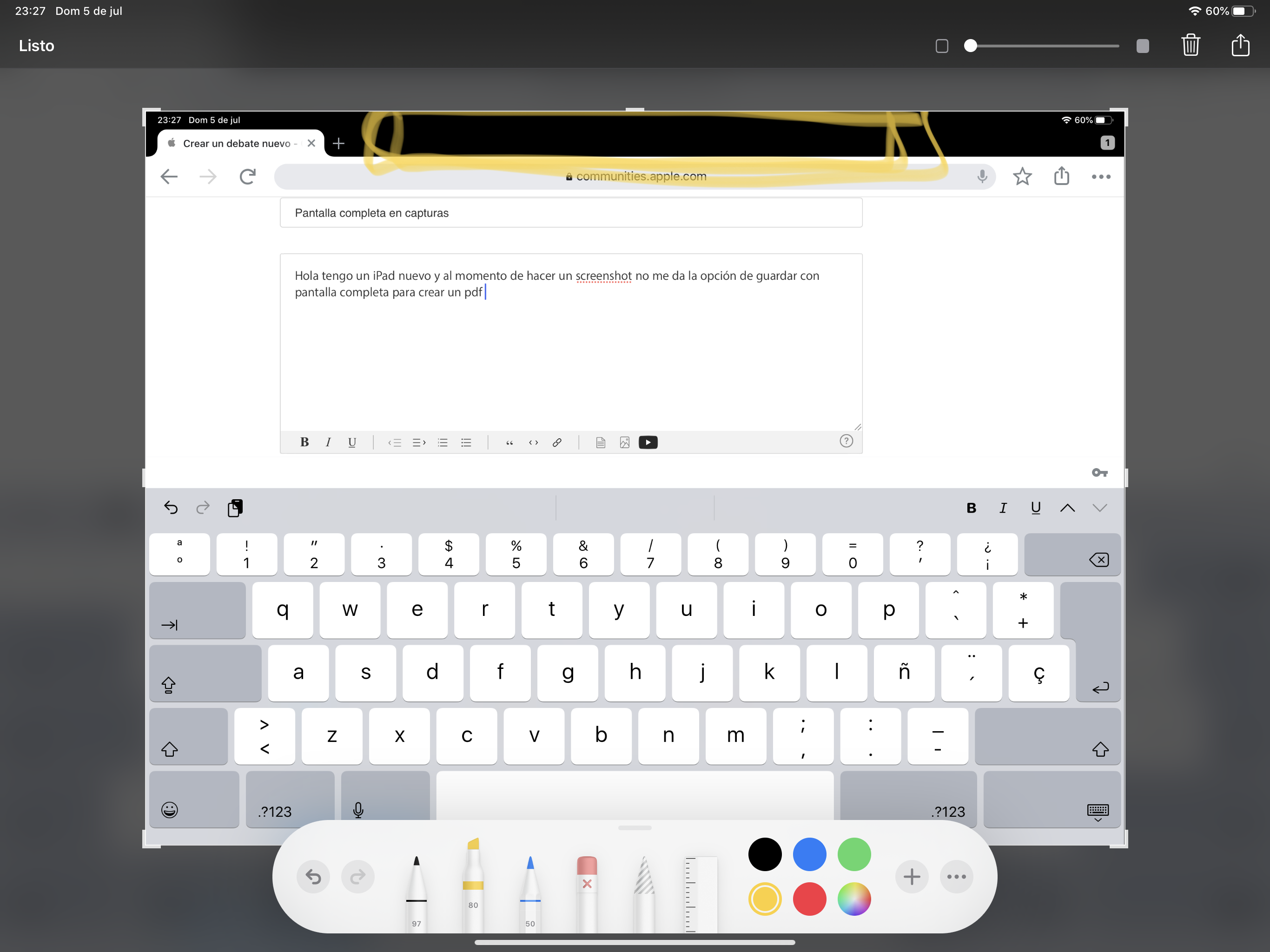 Hola, tengo un iPad nuevo y al momento de hacer un screenshot no me da la opción de guardar con pantalla completa para crear un pdf, que puedo hacer ya esta actualizado