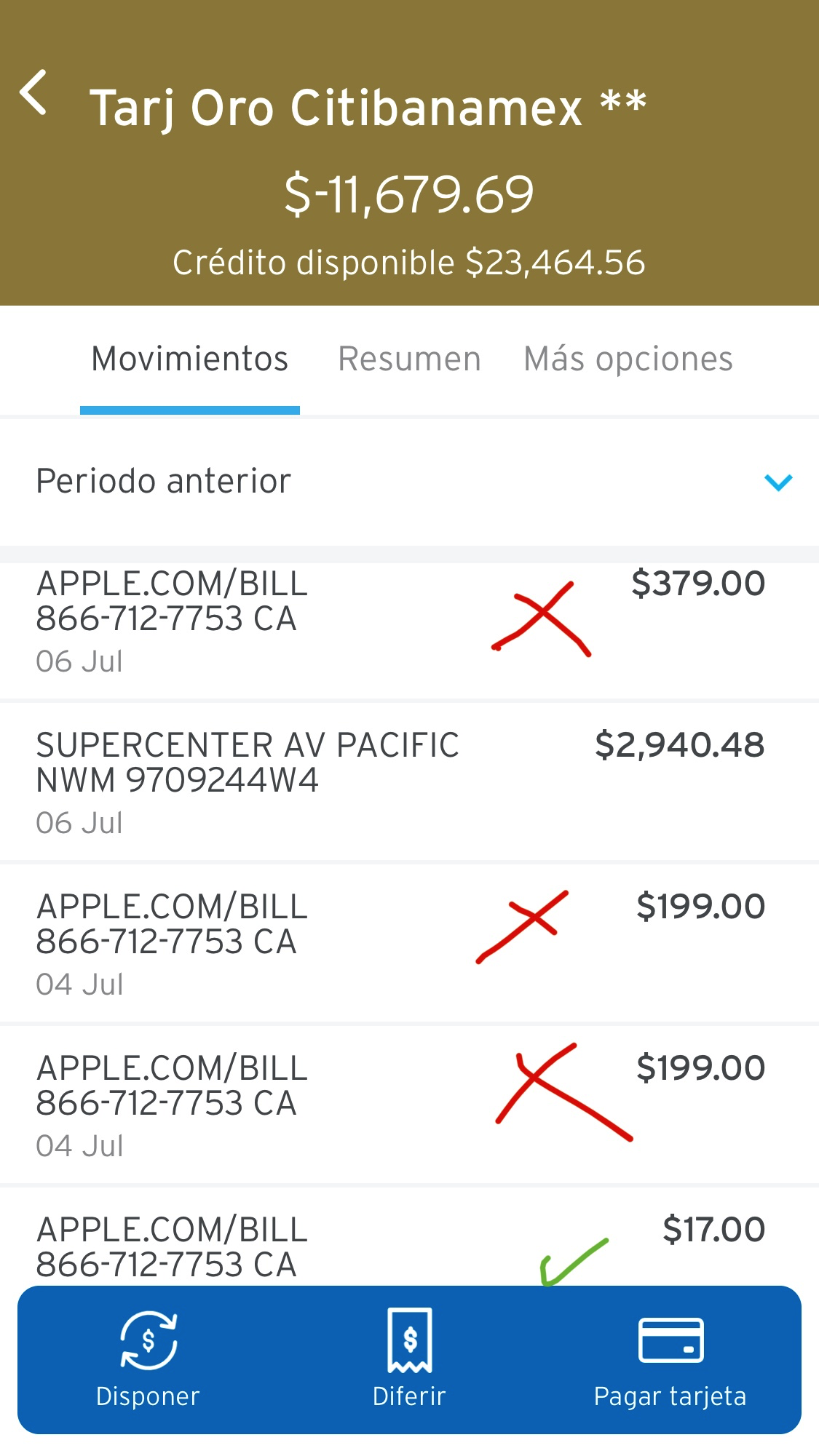 Hola yo hice el pago de más espacio en la nube el día 26 de junio de 2020. Pero los otros 3 cargos no son míos. Ya hablé a mi banco y me dicen que Apple hizo los cargos y ustedes los tienen que cancelar. Los cargos que deben cancelar son los 2 del día 4 de julio por 199.00 cada uno y el del día 6 de julio por 379.00. Yo no los hice. Por favor lo pueden cancelar.