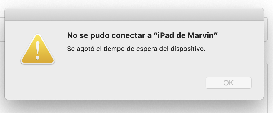 Acabo de comprar una macbook pro 2020 y al momento de intentar usar Sidecard para duplicar pantalla con el iPad, cuando selecciono conectar con iPad de Marvin (pues aparece el iPad) después de unos segundos aparece el mensaje con "no se pudo conectar con iPad de Marvin" "se agotó el tiempo de espera del dispositivo"
