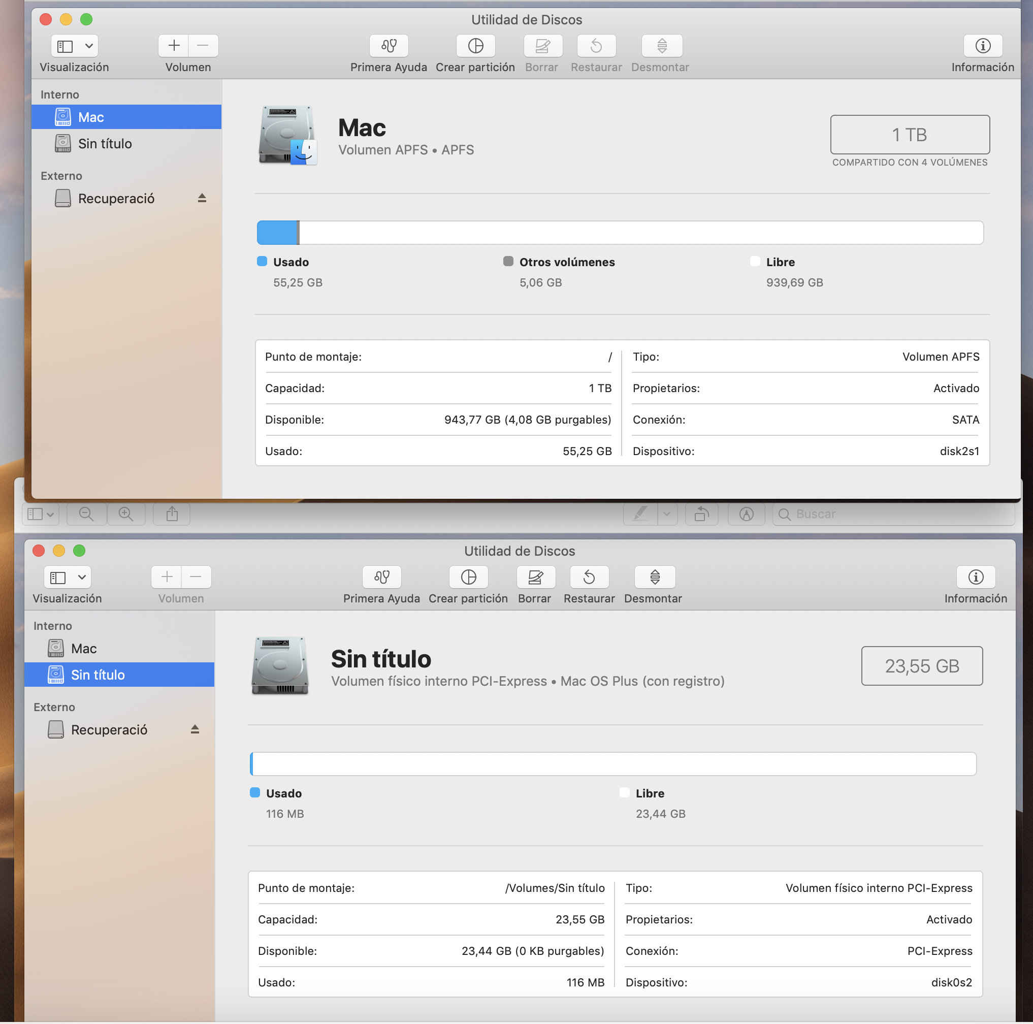 Tengo un iMac 27", con Mojave instalado 10.14.6. He llegado aquí después de irme de Catalina (Que no me generaba copias de según que apps) También tenía una partición con Windows. Todo funcionaba (Excepto las copias). Hasta que decidí instalar Mojave, partiendo de Sierra como origen y actualizando hasta Mojave (Con la correspondiente orden a Terminal para que no me actualize a Catalina). Me funciona absolutamente todo a la perfección (Catalina tenia averiado el Mail): Hasta aquí todo bien. Pero he visto que en la utilidad de discos a aparecido un nuevo disco, de nombre Sin Título de 23.55 GB. y prácticamente vacío(116 MB). No consigo detectar cual es su utilidad. No me molesta para nada pero me intriga, puesto que el disco de arranque. Tiene 1 TB.