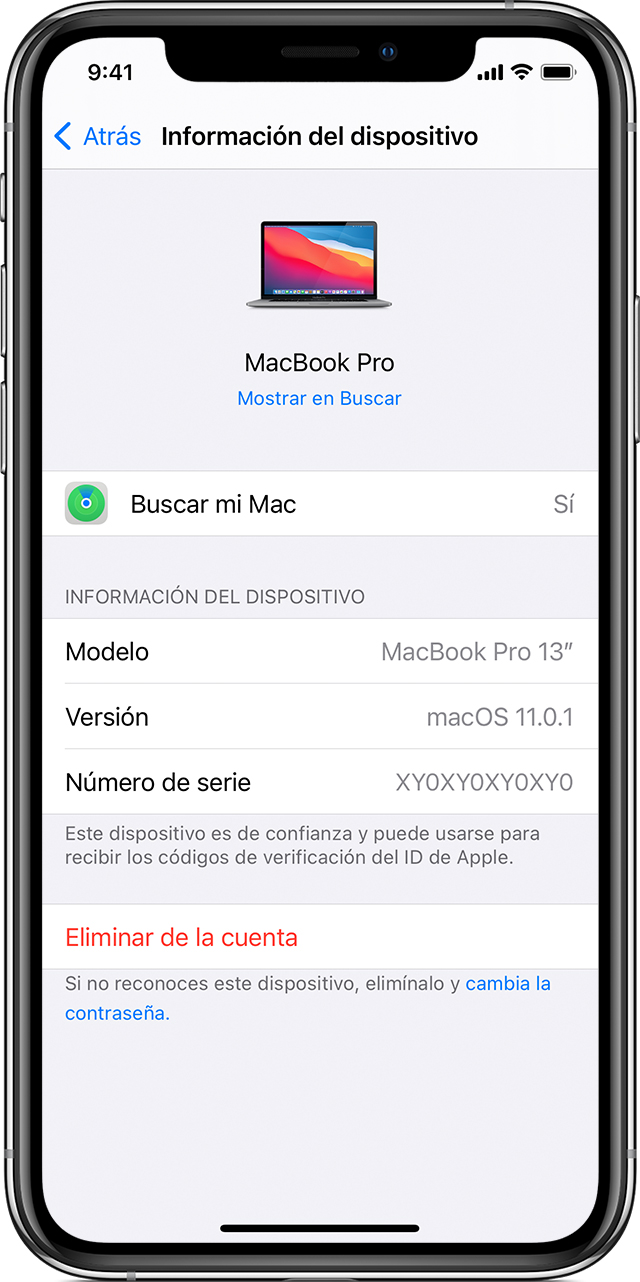 Si configuras la autenticación de doble factor para tu ID de Apple, eliminar un dispositivo garantizará que ya no pueda mostrar códigos de verificación. Tampoco tendrá acceso a iCloud y otros servicios de Apple, incluido Buscar, hasta que vuelvas a iniciar sesión con la autenticación de doble factor. El dispositivo no volverá a aparecer en la lista, a menos que vuelvas a iniciar sesión.