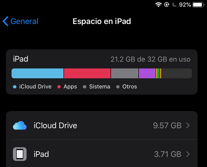 No solo esto, en almacenamiento también veo que aparece “iPad” usando casi 4GB pero cuando entro a ver que ocupa espacio, sencillamente no aparece nada, vacío. ¿Porque es esto y como lo soluciono? Agradecería si alguien tuviera la respuesta pues me descoloca ver tan lleno mi dispositivo cuando solo lo uso para trabajo y 2 juegos. Gracias.