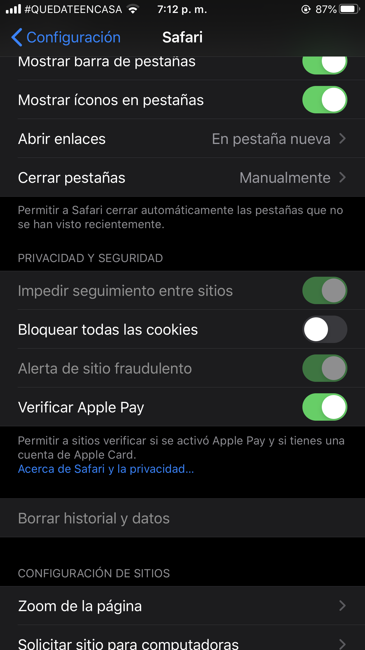 Prueba desde los Ajustes del iPhone, Safari, Borrar historial y datos de sitios web.