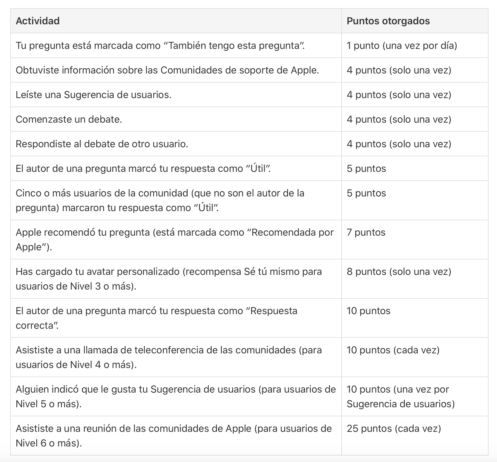 El gráfico siguiente indica el tipo de actividades necesarias para conseguir puntos y cuántos puntos obtendrás por cada actividad. Para subir a nivel 2, necesitarás 150 puntos. Ya tienes 61. 👌🏻 Este tutorial te indica cómo participar en la Comunidad de Apple para obtener puntos, niveles y recompensas. A medida de que subas de nivel, obtendrás ciertos beneficios según el nivel. Es como un juego. 😎 Solo necesitas, energía, paciencia y generosidad hacia los demás.👩🏻💻🧑🏻💻