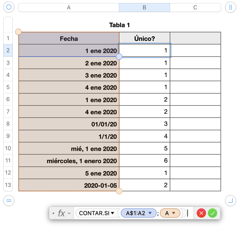 Fórmula en B2 =CONTAR.SI(A$1:A2;A)