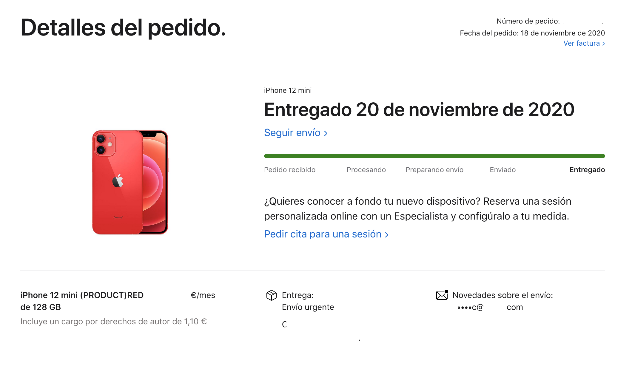 Pues lo dicho, el pasado 18 de noviembre realicé el pedido de un iphone 12 mini y lo recibí el 20 de noviembre. Hoy es día 29 de noviembre, de manera que estoy en el plazo de devolución legal. El caso es que entro en la web de Apple Store con mi usuario y veo mi pedido como entregado. Hasta ahí todo correcto, pero lo que sucede es que la instrucciones de la web de la Apple Store indican que devo entrar en mi pedido con mi usuario y una vez dentro veré la opción de "devolución de mi pedido", entoces solo deberé pulsar en ella e imprimir las etiquetas para iniciar el proceso de devolución. Pues bien, entro en mi pedido con mi usuario y no veo por ningún sitio esa opción de "devolución de mi pedido". Esto es todo lo se ve en los "Detalles del pedido" (la info personal está convenientemente borrada):