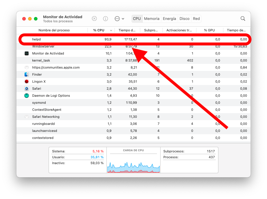 Desde que he actualizado a macOS Big Sur he detectado que existe el proceso “helpd” que consume prácticamente el 100% de la CPU ralentizando en muchas ocasiones el funcionamiento del Mac.