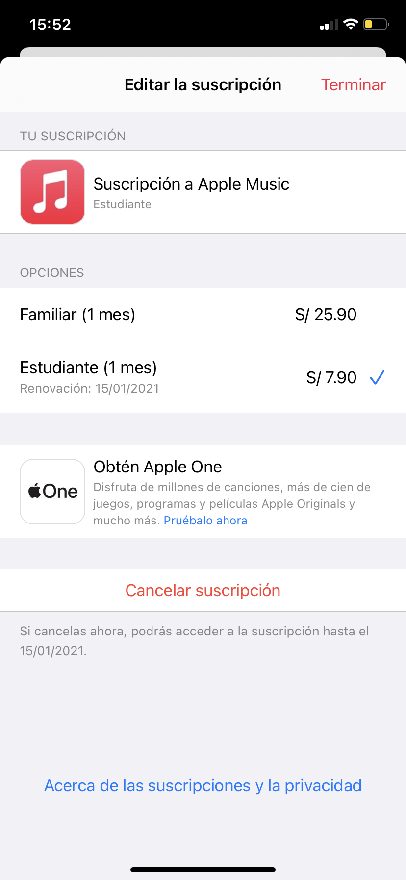 Hola, estoy suscrita a Apple Music con el plan de estudiante, el monto a pagar es de 7.90 pero me han cobrado 8.64, no entiendo porqué me han cobrado ese monto