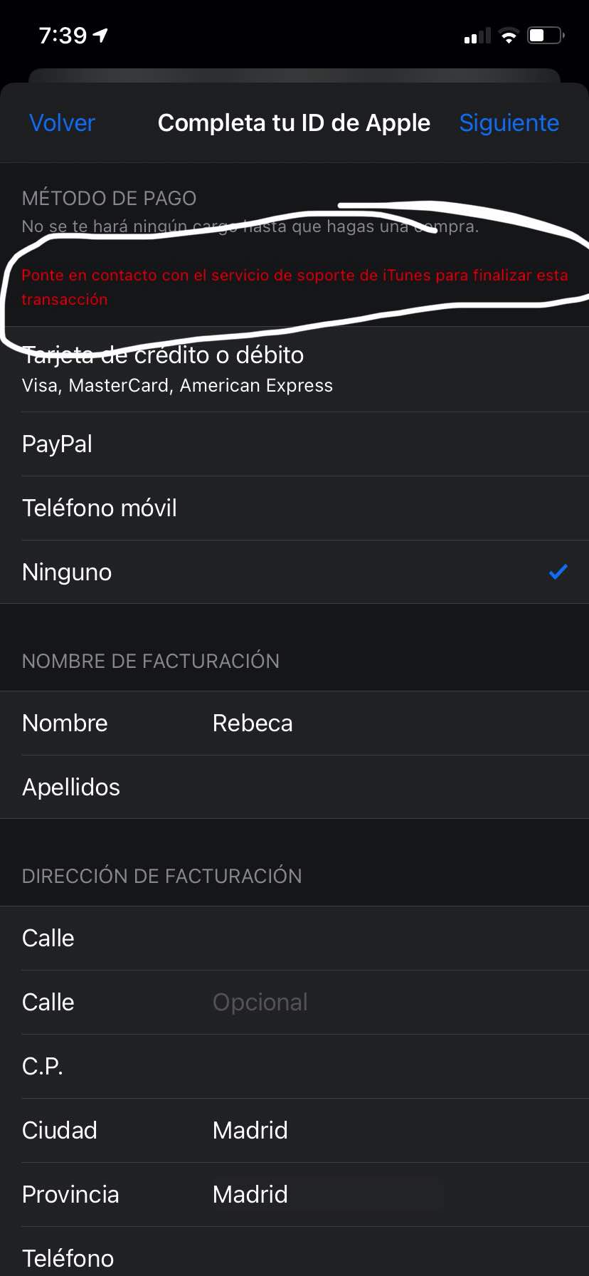 Porque me pone ponte en contacto con el servicio de soporte de iTunes para finalizar esta transacción