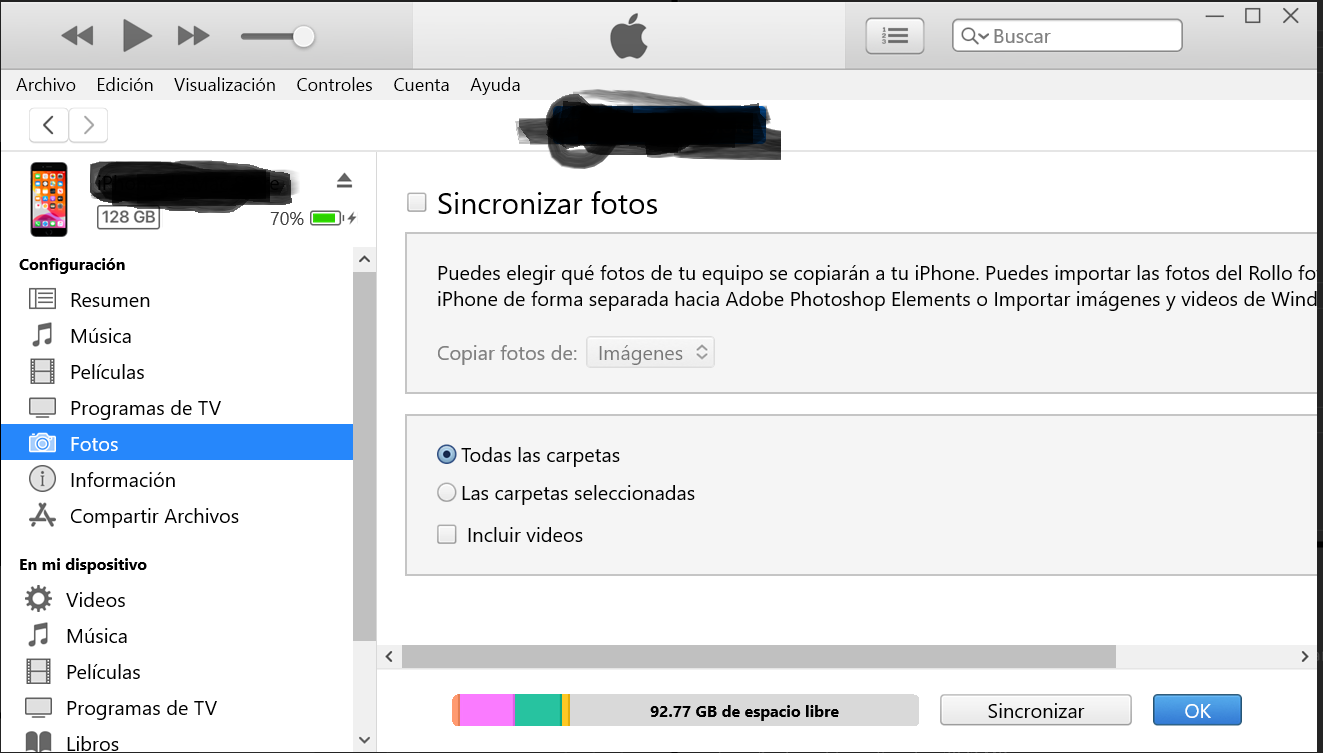 Selecciona sincronizar fotos y allí puedes seleccionar de donde quieres sincronizar las fotos.