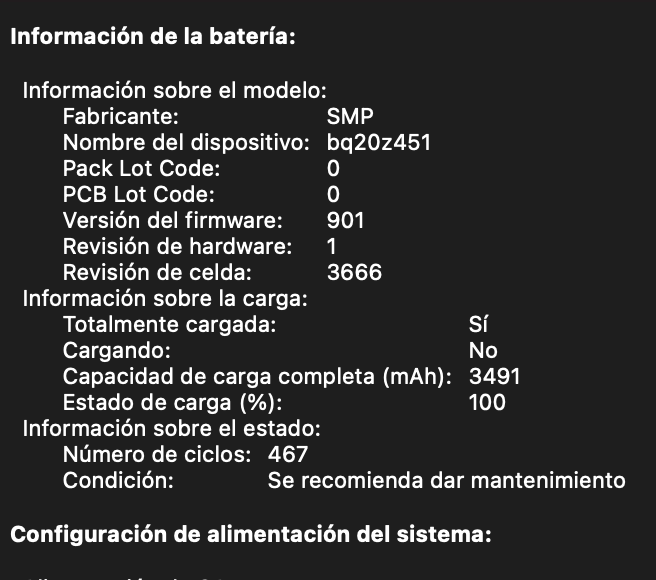 Hola, actualice mi mac a macOS Big Sur 11.2.1 y me salio el mensaje "Se recomienda dar mantenimiento", la verdad no entiendo porque me sale esto, tengo un MacBook Pro (13-inch, 2017, Two Thunderbolt 3 ports) y la bateria hasta ahora tiene 467 ciclos despues de casi 3 años.
