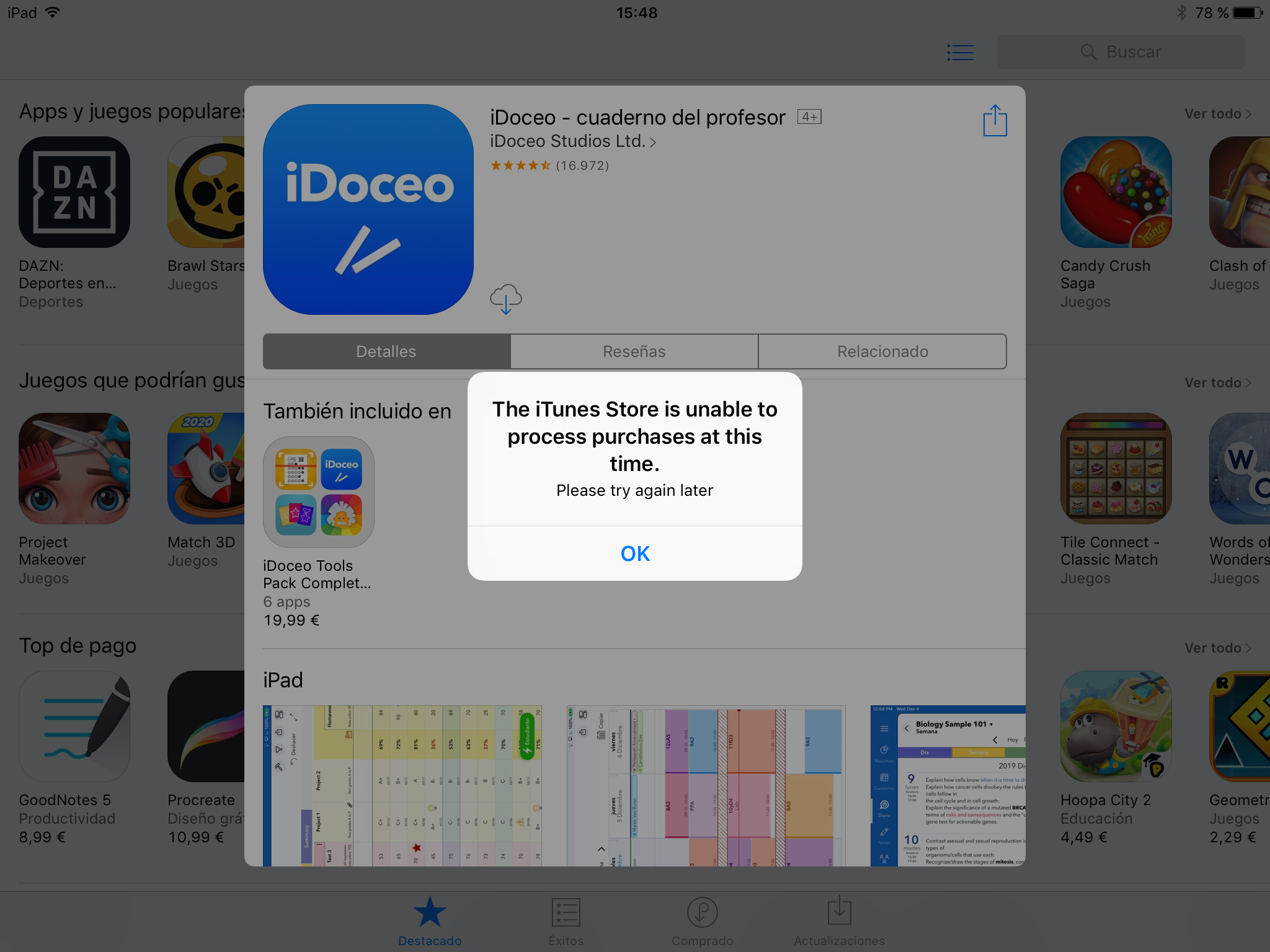 Intentó instalar en iPad una app ya comprada. Al dar a descargar sale el error que aparece en la imagen. He leído que es un problema de Apple, pero cuando intento instalar o descargar algo en el iPhone, con la misma cuenta de Apple, lo instala sin problemas. ¿Como se puede solucionar?