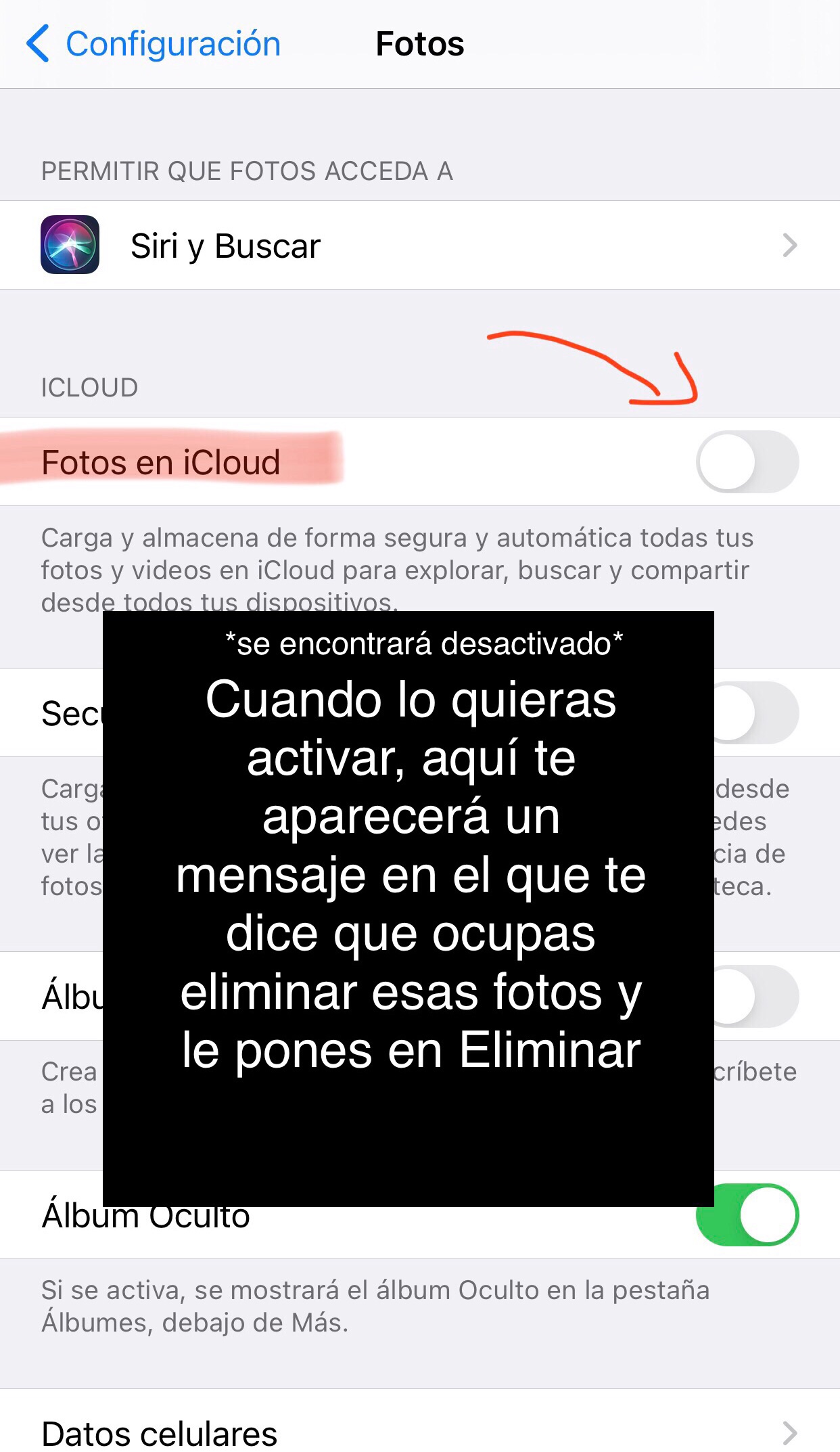 - Te aparecerá una opción que dice “Fotos en iCloud” este comúnmente se encontrará desactivado.