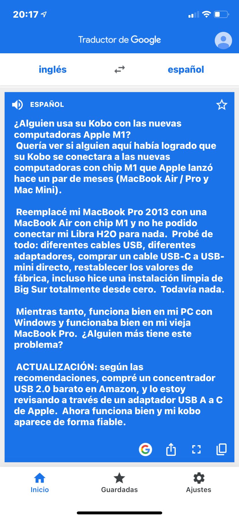 "Este es Rakuten Kobo contactándole con respecto a un problema reciente en el que nuestros eReaders no son detectados por Macbooks con chips M1 u otros dispositivos que utilizan puertos USB-C.