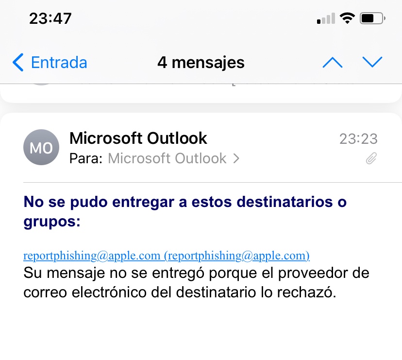 He recibido un mail supuestamente de apple sobre mi ID y he querido reenviarlo a reportphising@apple.com tal y como aparece en el soporte técnico de apple, pero me rechaza el mail y no se puede enviar