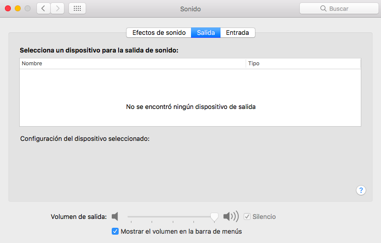 Buenas noches, mi mac no emite sonido por bocinas internas ni externas. aparece un símbolo de prohibido (como se ve en la imagen) y tampoco me deja modificar nada desde configuración del sonido. Espero puedan ayudarme!