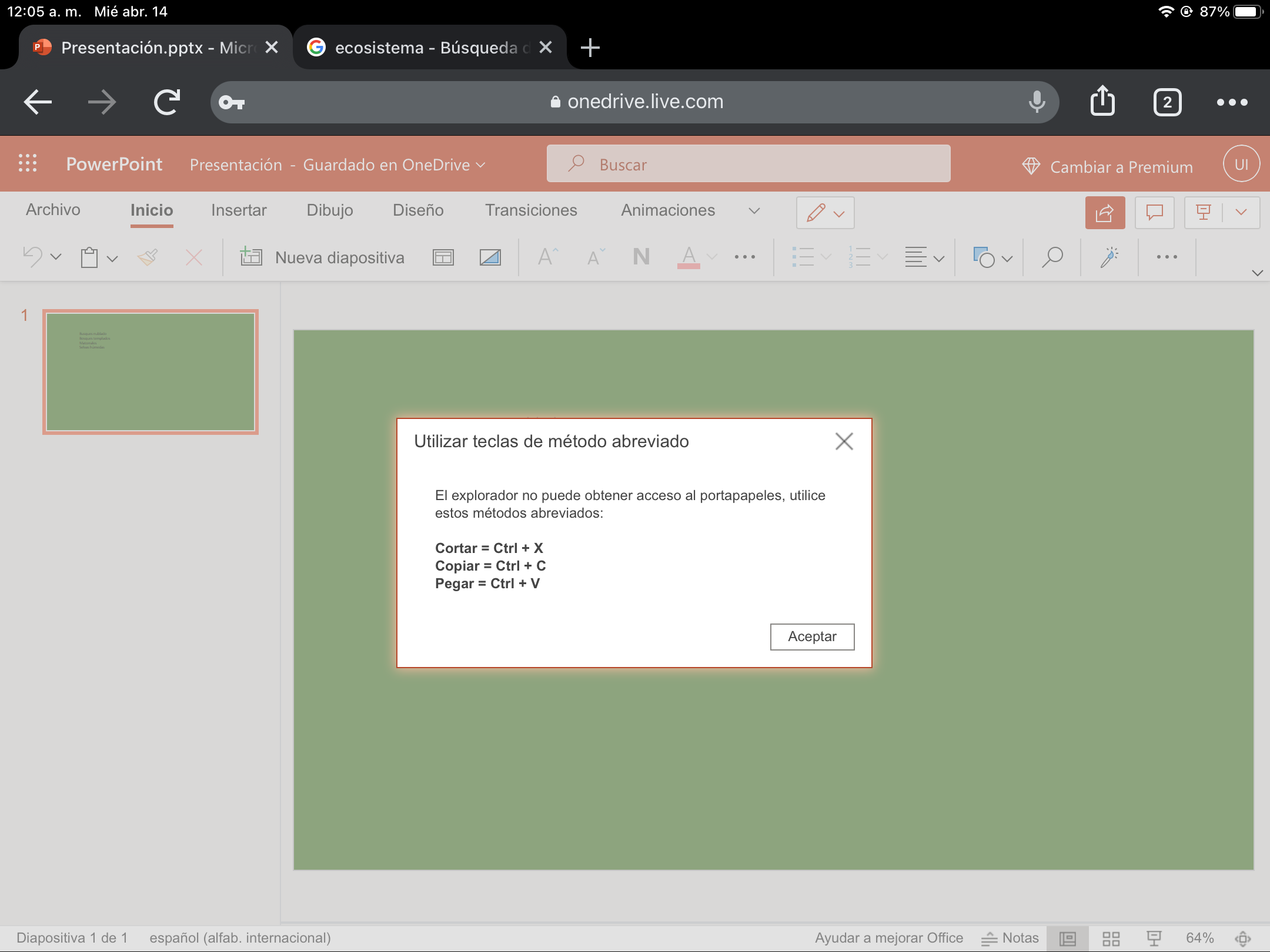Cuando quiero copiar una imagen de Google y pegarla a PowerPoint o word, me dice que “El explorador no puede tener acceso a porta papeles y que utilice los métodos abreviados que es (ctrl C y ctrl V). Como puedo soluciónar esto o como puedo hacer lo de ctrl C y V si no tengo un teclado físico..
