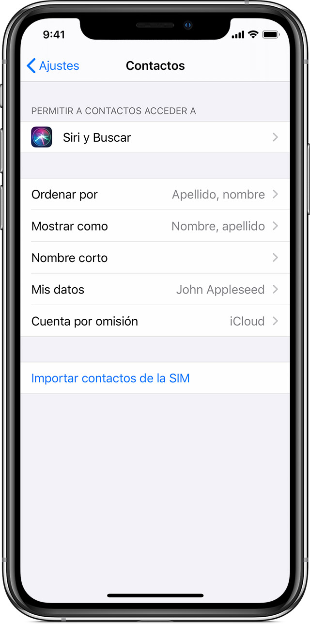 Puedes elegir cómo ordenar los contactos, por ejemplo, alfabéticamente por nombre o apellido. Ve a Ajustes > Contactos y ajusta las siguientes opciones: