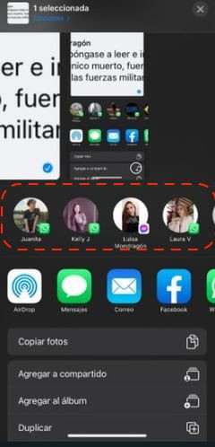 Tengo un iPhone 12 y al momento de intentar enviar alguna imagen, captura de pantalla en el menú de "Compartir" no me aparecen en el menú de sugerencias los contactos de Whatsapp. Solo me aparecen los de la Herramienta "Mensaje"