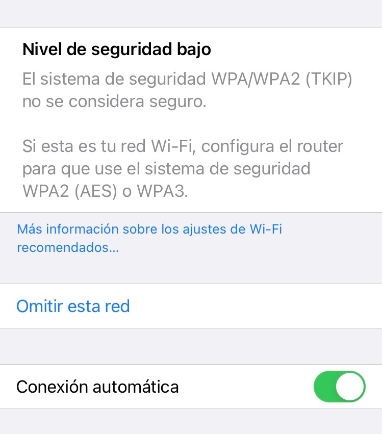 La alerta que ves en tu iPhone indica que tu router está configurado con un nivel de seguridad bajo y antiguo. La configuración recomendada es WPA3 Personal y si puedes debes configurar tu router a este nivel de seguridad. Si necesitas más ayuda te sugiero contactar a tu proveedor de servicios de internet. El siguiente recurso incluye más detalles sobre este tema: