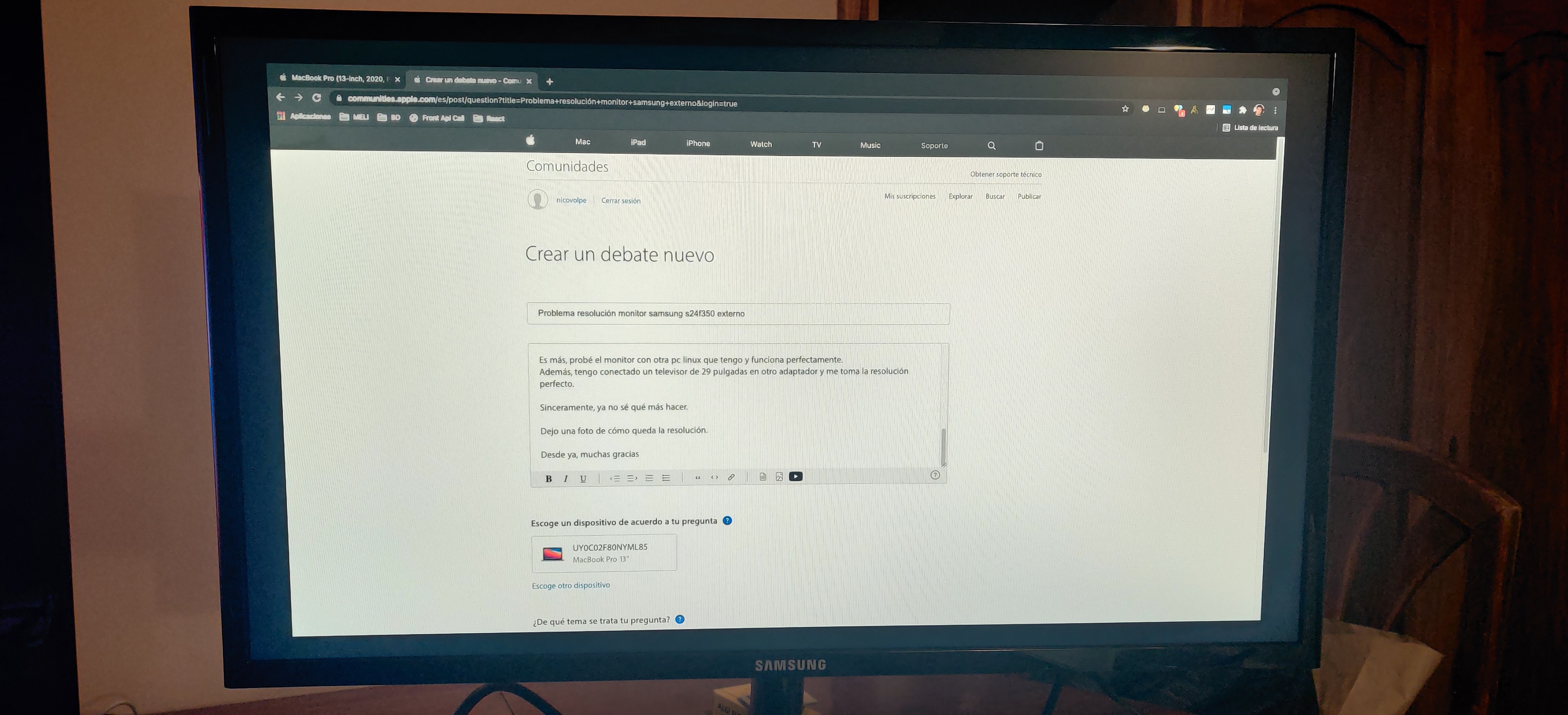 Tengo un monitor externo samsung s24f350 que admite hasta una resolución de hasta 1920x1080. Cuando conecté mi macbook pro por primera vez, no me reconoció la resolución. Actualicé el sistema operativo y al reiniciar el equipo anduvo correctamente.