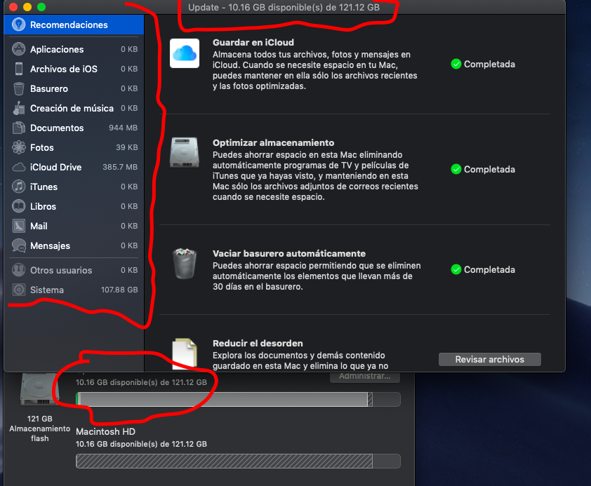 tengo un problema con el almacenamiento de mi macbook, pues ya le hice limpia de archivos cache entre otros, pero solo le reduje una minima parte del almacenamiento ocupado. Lo que más pesa en el disco duro es el sistema operativo, pues la capacidad de almacenamiento de mi ordenador es de 128 gb, y el espacio que llena el apartado de ¨sistema¨ es de 107 gb. no se que hacer para liberar parte de ese espacio ya que no me permite acceder para gestionar dicho acaparamiento. Necesito de su ayuda!!!
