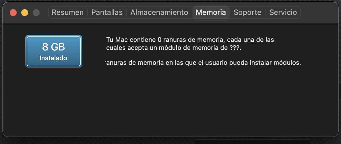 "Tu Mac contiene 0 ranuras de memoria, cada una de las