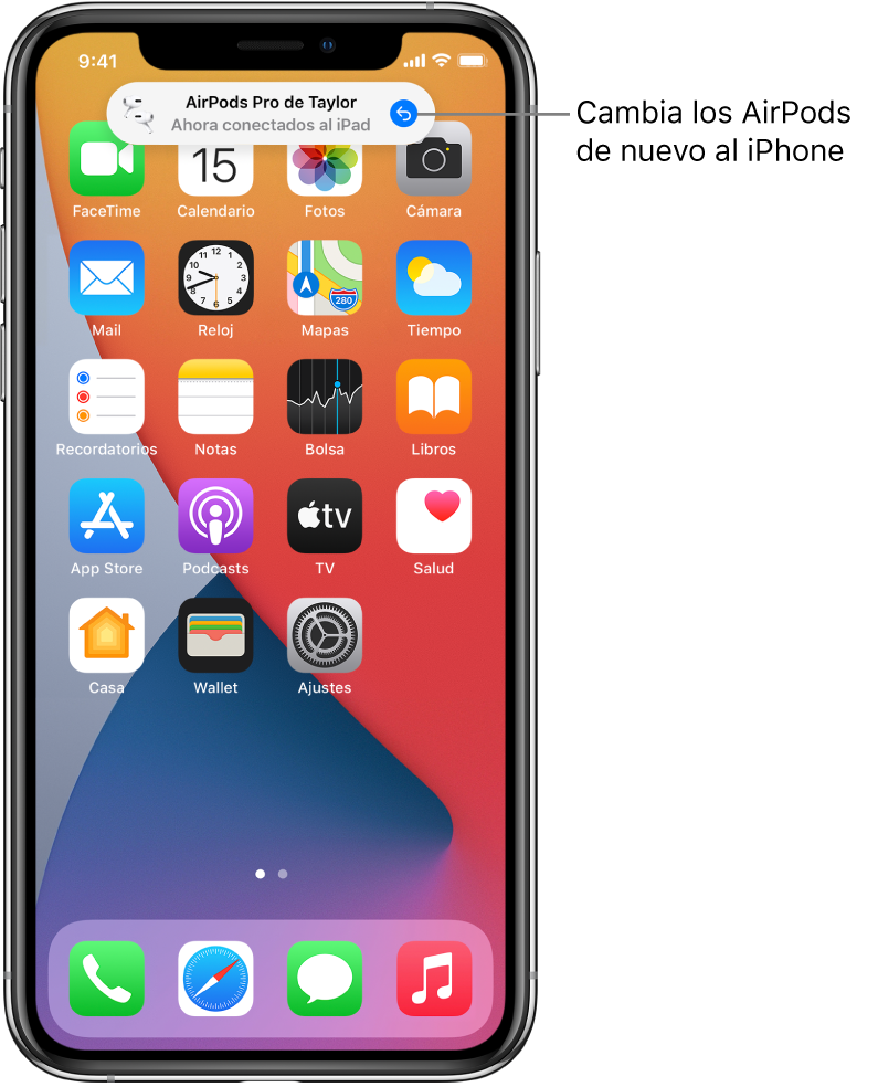 Si los AirPods cambian del iPhone a otro dispositivo, pero quieres que permanezcan conectados al iPhone, pulsa  (en el aviso “Ahora conectados al” de la parte superior de la pantalla del iPhone).