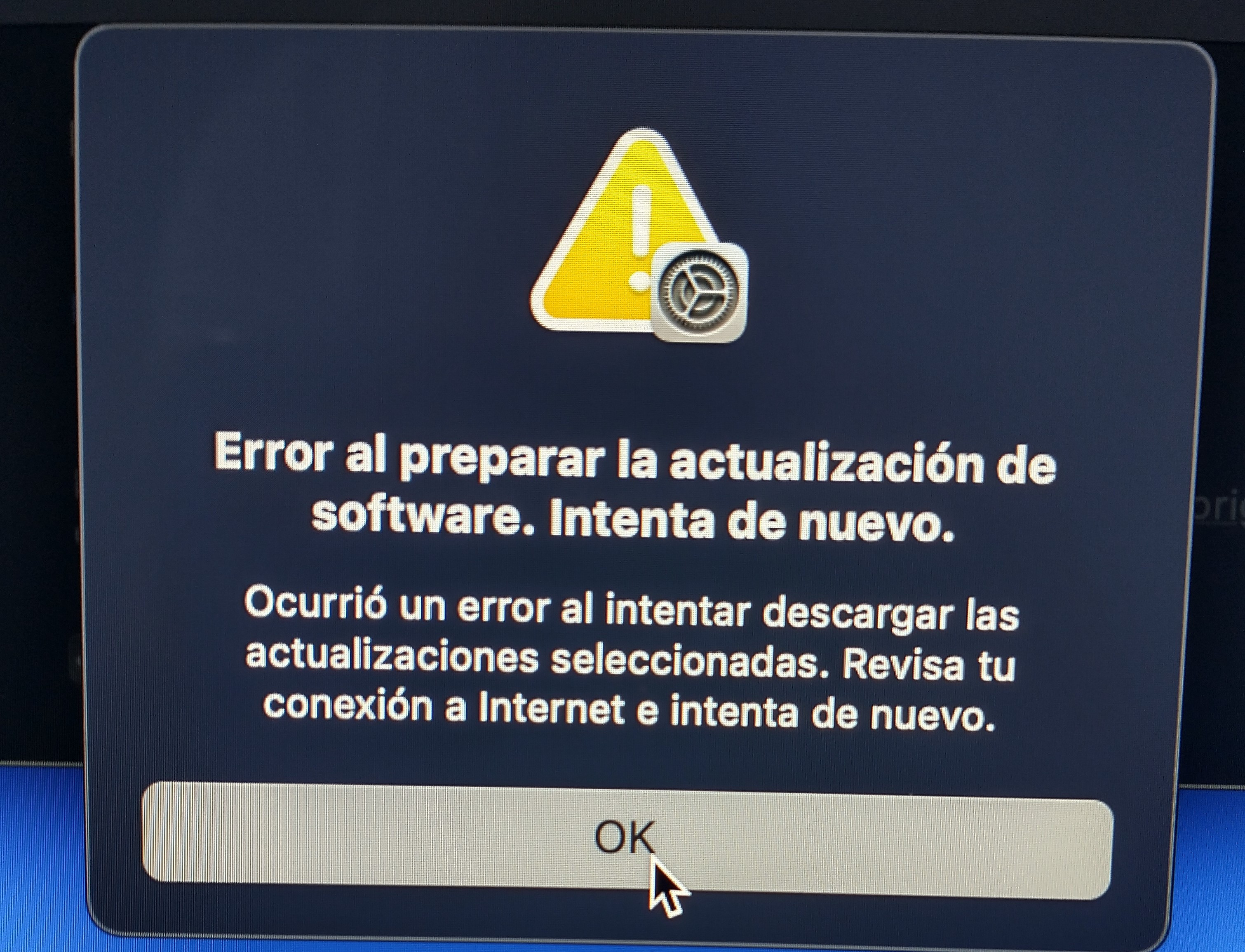 hola, mi nombre es Gaston. qusiera ayuda porque al quierer actualizar mi iMac a Big Sr 11.5.2. la barra de progresion que marca 2,54GB, avanza poco mas de la mitad, luego avisa que quedan 15' minutos mas, luego 10', luego 5' pero demora muchisimo mas y al final aparece un cartel con un triangulo amarillo que dice "ERROR AL PREPARAR LA ACTUALIZACION DE SOFTWARE. INTENTA DE NUEVO" y debajo figura: "Ocurrio un error al intentar descargar las actualizaciones seleccionadas. Revisa tu conexion a internet e intenta de nuevo".