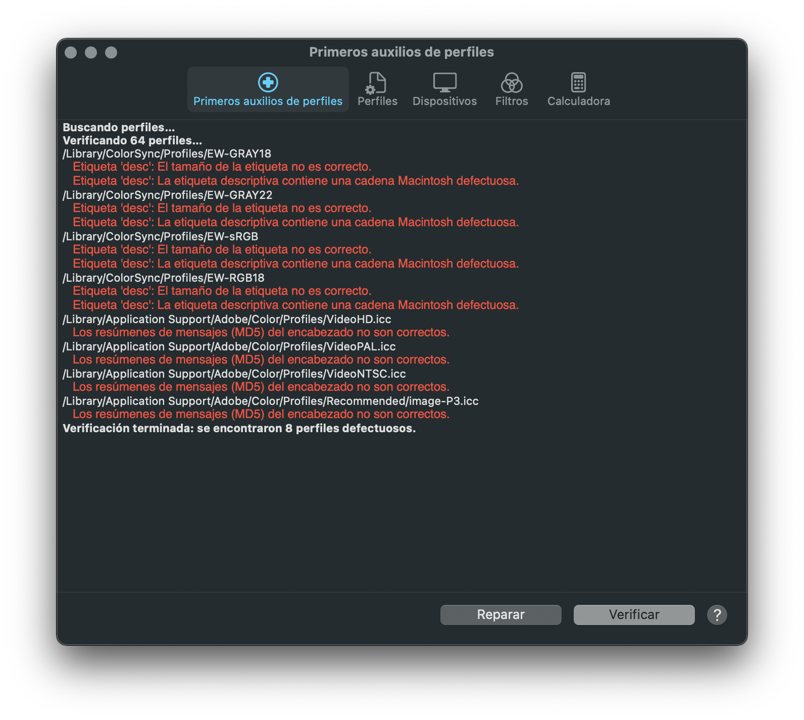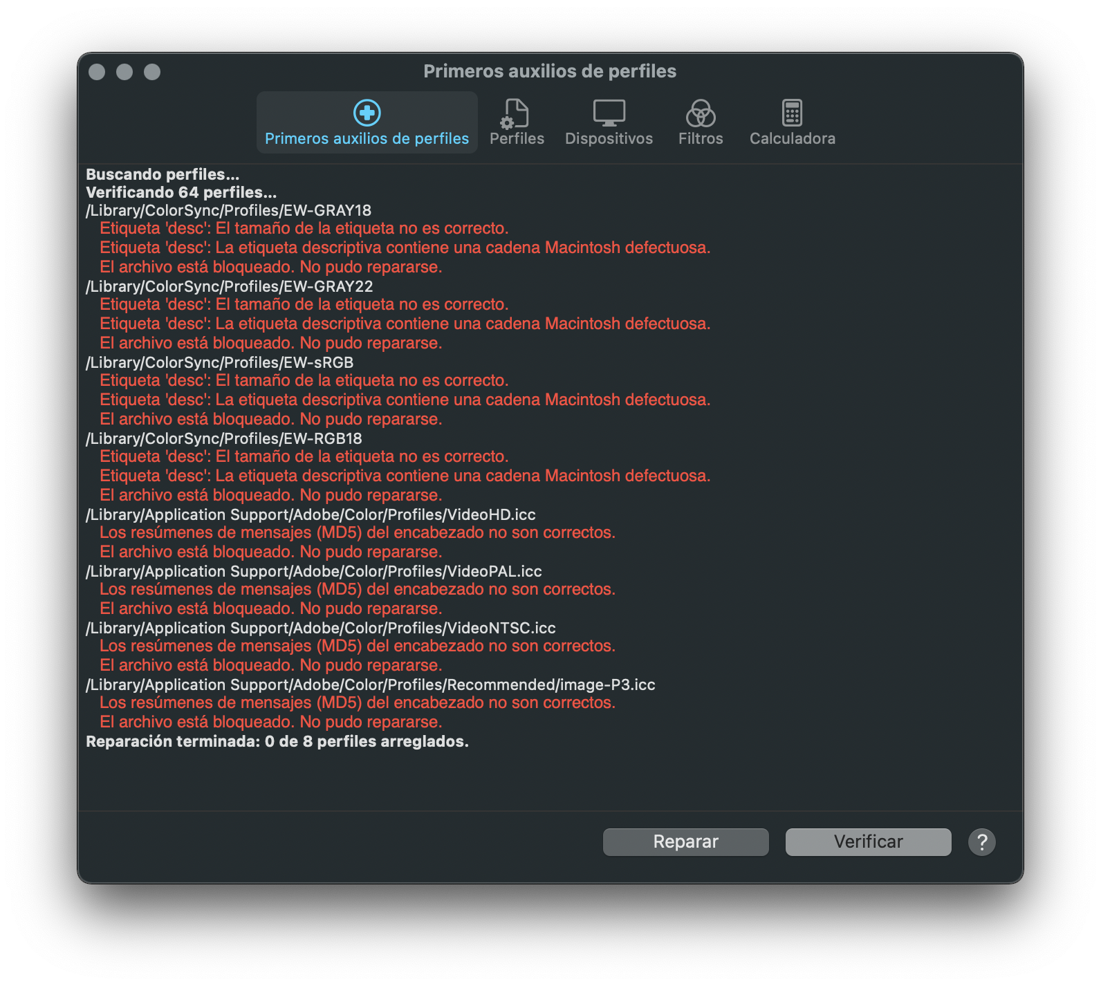 Por otra parte abrí la Utilidad ColorSync y en "Primeros auxilios de perfiles" presioné "Verificar" y arrojó errores: