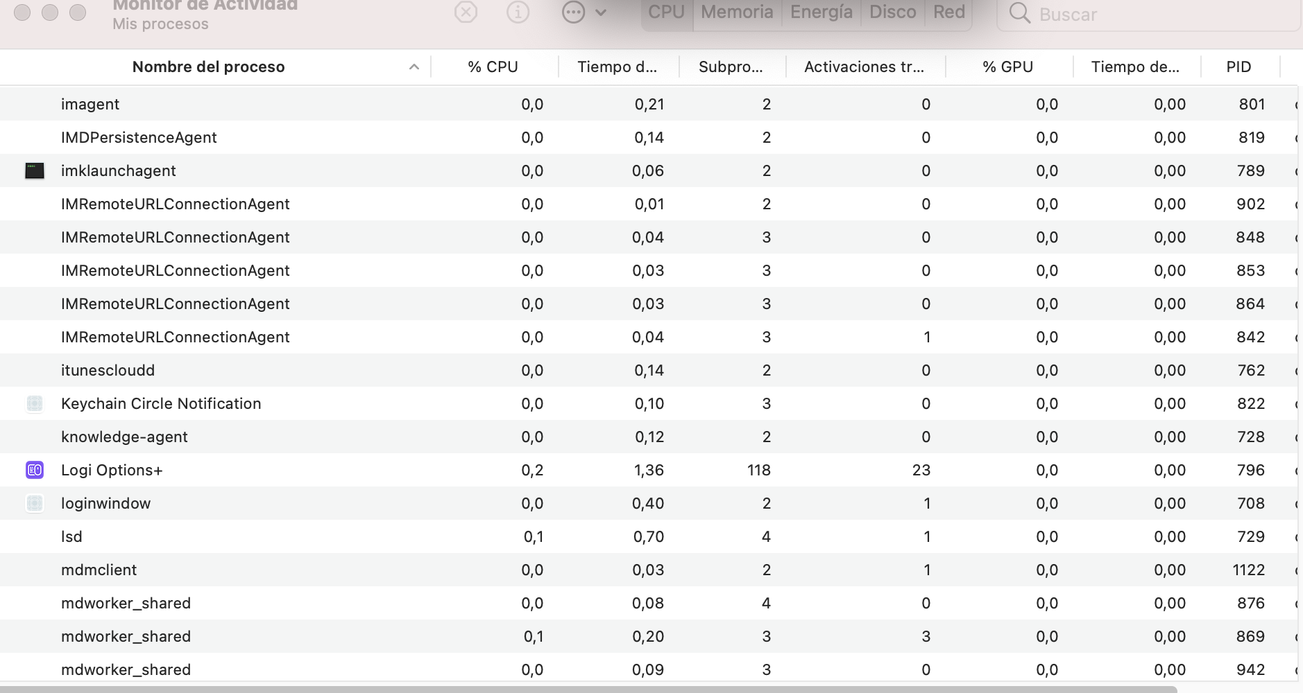 Al tratarse de un iMac de mediados de 2017 decliné la reparación e hice una simple comprobación; creé un nuevo usuario como administrador para ver si el problema con el elevado uso de CPU por parte del kernel_task persistía, y cuál fue mi sorpresa cuando pude comprobar que en este nuevo usuario no existe el proceso kernel en el monitor de actividad. Creé una tercera cuenta de usuario para asegurarme y sucedió lo mismo (adjunto captura del monitor de actividad ordenado alfabéticamente en el que no aparece kernel_task).
