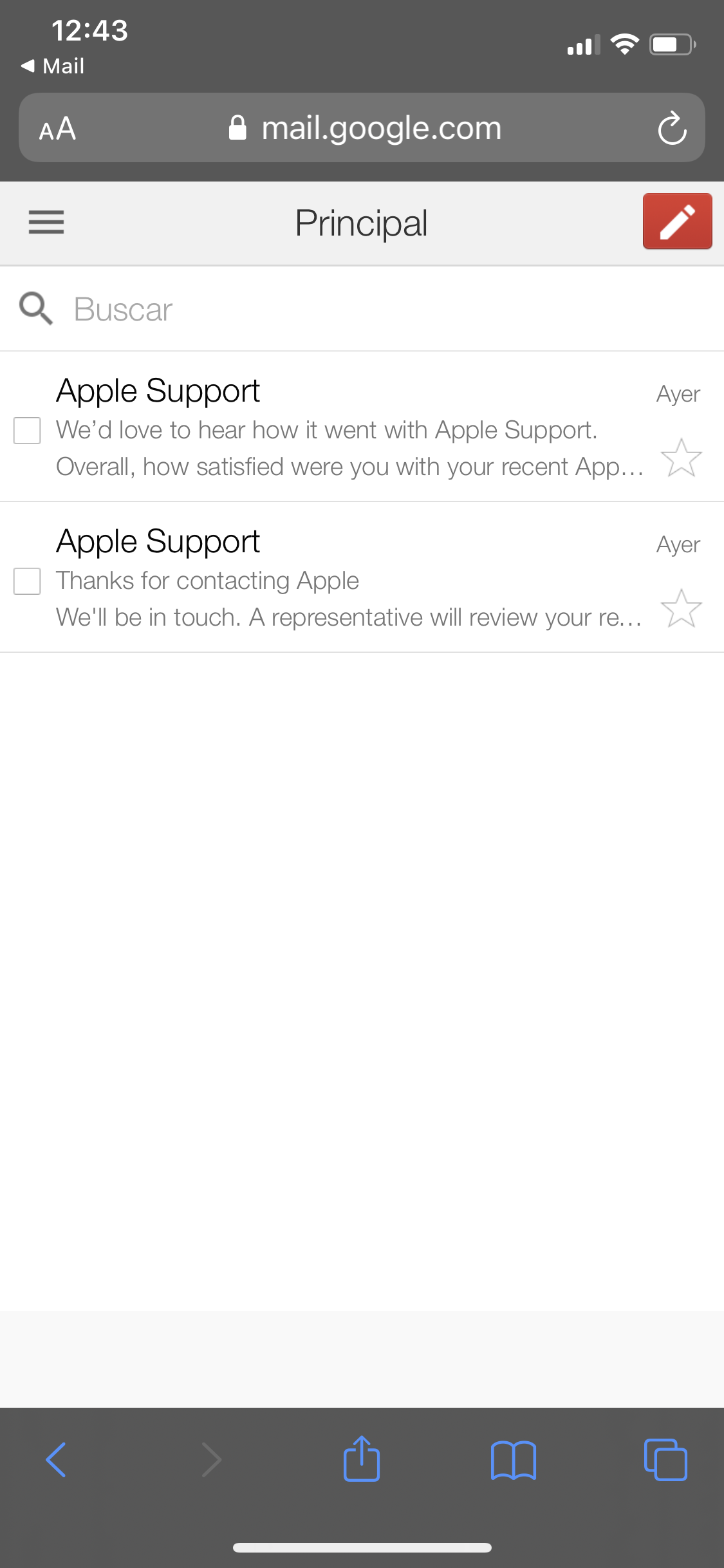 Perfecto, ahora entra en gmail.com, identifícate y mira si ahí tienes tu correo; porque una cosa es el correo en este caso del iPhone que lo miramos por Mail, la app del móvil, y otra cosa es el correo de gmail que está en la web, sólo compruébalo, ya nos cuentas.