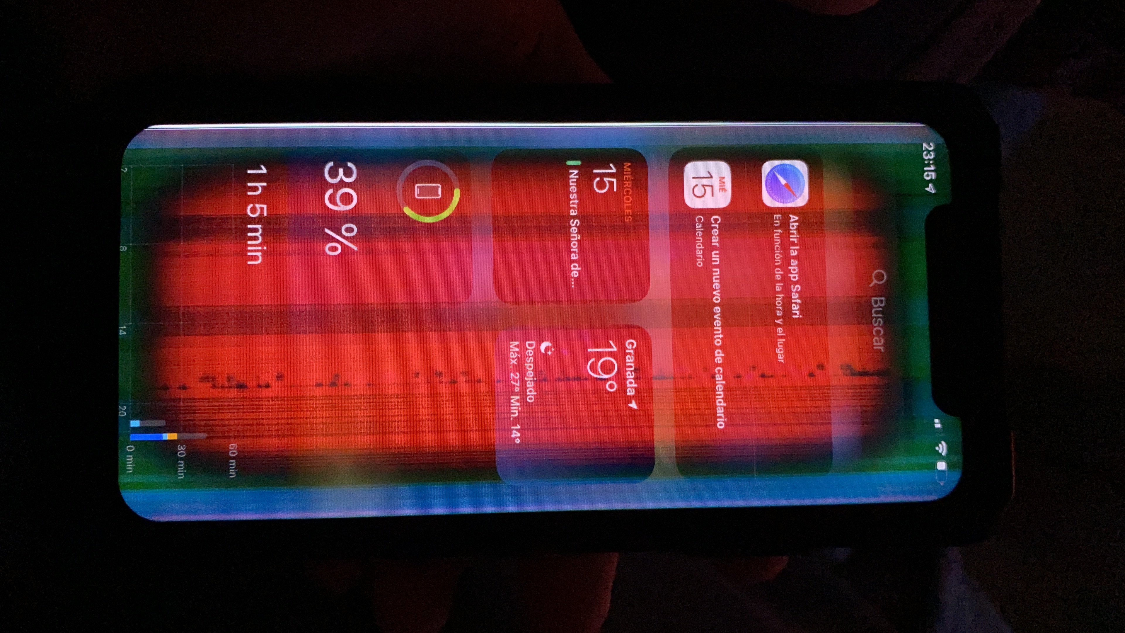 Hola, mi problema es que mi iPhone 11 estaba cargando normal y al ir a cogerlo me han empezado a aparecer rayas de colores que hacen que no se vea bien, he estado explorando por los blogs de Apple y he hecho todo, he reinícialo, he sacado y metido la tarjeta SIM (que me la reconoce sin problema), he restaurado de fábrica, he hecho lo del modo DFU y sigo sin respuesta. No se ha dado ningún golpe, no ha sido manipulado por nadie externo ni nada, simplemente me han salido rayas, he actualizado el software hace 3 días a la 14.8 pero no creo que ese sea el problema porque también he bajado de versión a la 14.7 y sigue igual. El único problema que no he podido solucionar ha sido el de comprobar si el cable de la pantalla LCD está conectado correctamente porque obviamente no voy a abrir mi dispositivo. Adjunto foto de cómo se ve el móvil. Espero respuesta rápido ya que necesito el móvil activo cuanto antes por trabajo. Muchas Gracias