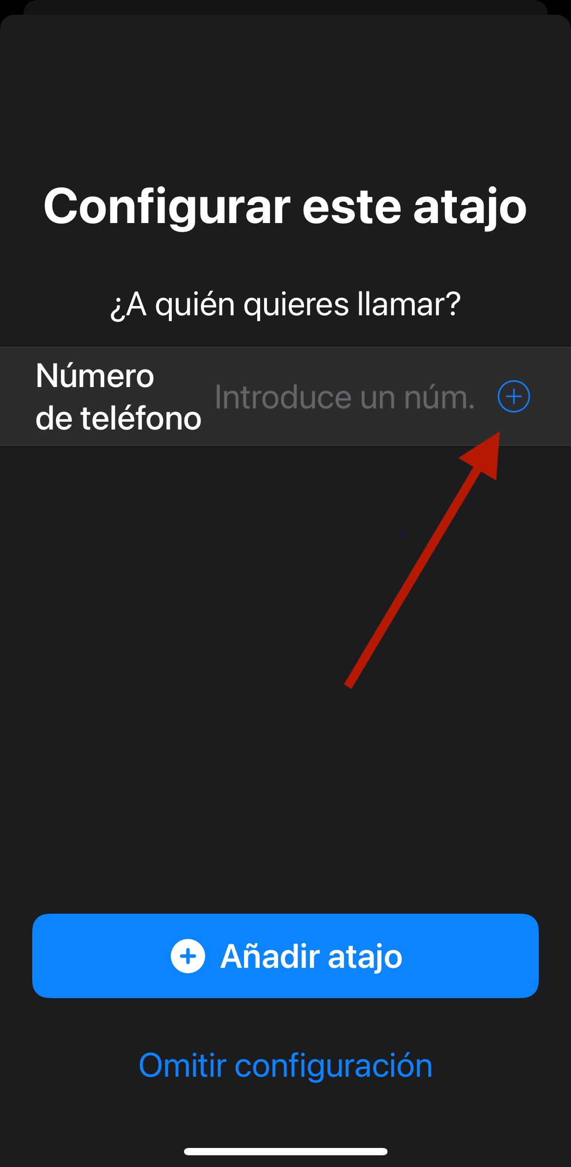 En “número de teléfono“ indica los números de teléfono que quieras configurar en marcación rápida. Una vez introduces el primero, pulsa el icono con signo (+) de la parte derecha y se mostrarán todos los contactos. Pulsa cancelar y sigue añadiendo los números con el teclado numérico, ya que si añades directamente el contacto, te dará error al ejecutar atajo (si no se muestra el teclado numérico, pulsa en el número que acabas de introducir).