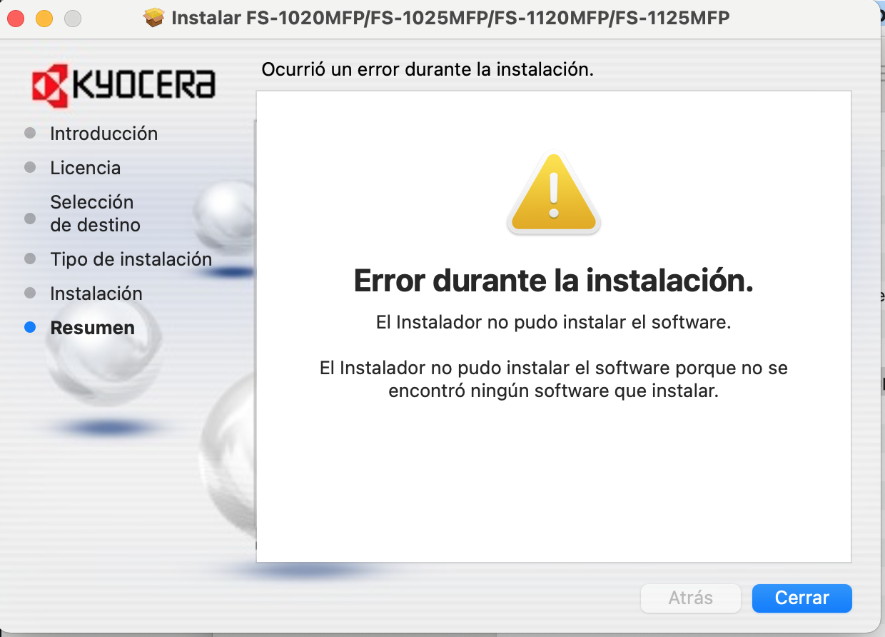 El problema es que cuando voy a instalar el driver Kyocera en mi Mac en la mitad del proceso no reconoce el soft