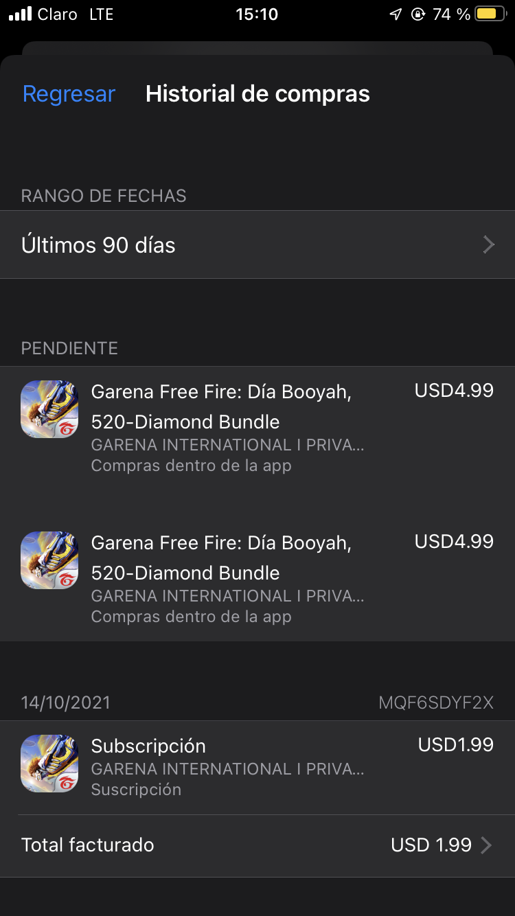 Realice una compra por USD 4.99$ dentro de la app free fire y me realizaron doble cobro y dentro de la app solo recibí el resultado de lo que sería una compra.