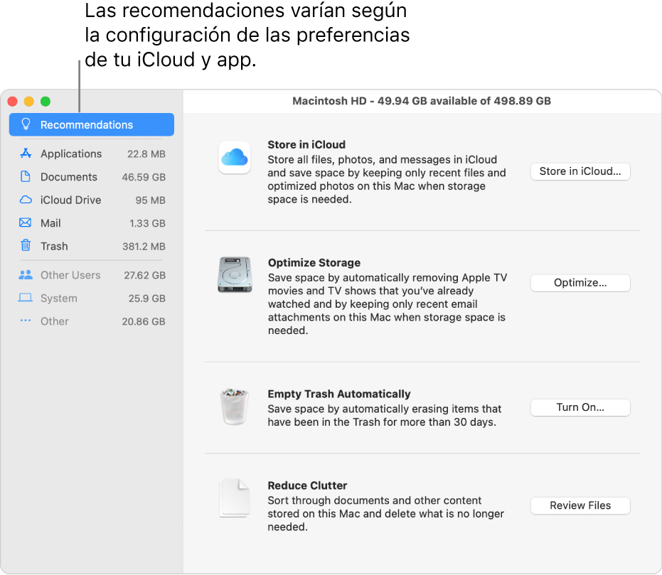 - Consulta las recomendaciones mostradas y decide cómo optimizar el almacenamiento de tu Mac.
