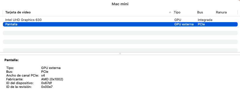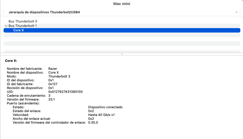 Durante el año pasado estuve trabajando con esta configuración : Minimac 2018 Big Sur + Razer core + AMD Radeon 580 X. Trabajó normalmente con software de video (Millumin) y el rendimiento con este set era espléndido. Desafortunadamente, ha dejado de funcionar. Revisando información del sistema se reconoce la Razer X, pero la tarjeta gráfica no. Adjunto unas imagenes.