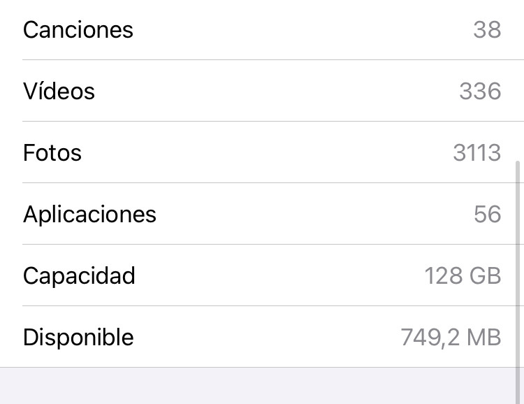 de 128 gb tengo libres 749,2 MB. he conectado mi telefono al macbook pero no se como liberar más espacio. Estoy en pleno proceso de limpiar la galeria, con lo que recuperaré memoria, lo mismo voy a realizar con la memoria de alguna de las apps que uso.