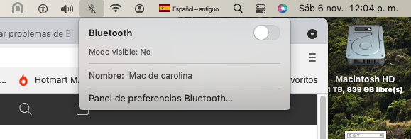 Lo otro que veo es la conexión a Bluetooth, aparece en la barra de herramientas en MODO NO VISIBLE, y cuando trato de ingresar por el panel de preferencias, dice error también