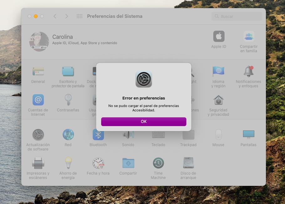 Coloqué el capture tratando de ingresar a accesibilidad como ejemplo, pero ocurre con la mayoría de las funciones de Preferencias del sistema, teclado, mouse, accesibilidad etc, la mayoría de las herramientas del panel de preferencias no funciona, me da mensaje de error.