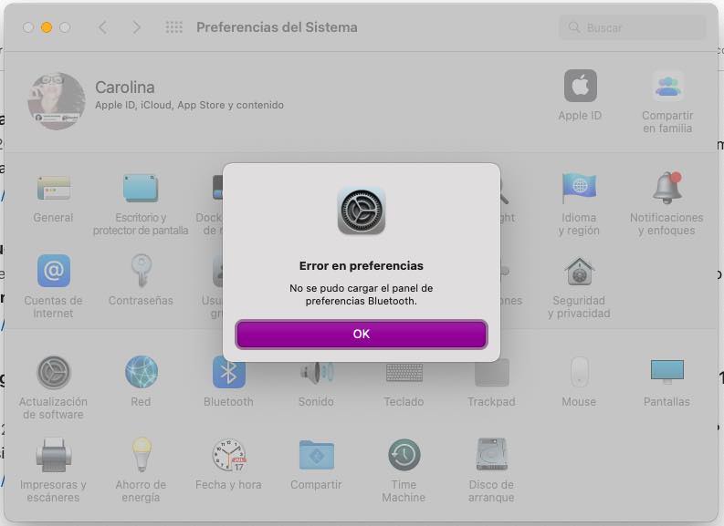 Este es el mensaje cuando trato de ingresar al panel de preferencias, ves? , el mismo cuando trato de ingresar al mouse, accesibilidad, teclado etc, me estoy volviendo loca, si se dañó el Bluetooth estoy en serios problemas, vivo en Venezuela jeje
