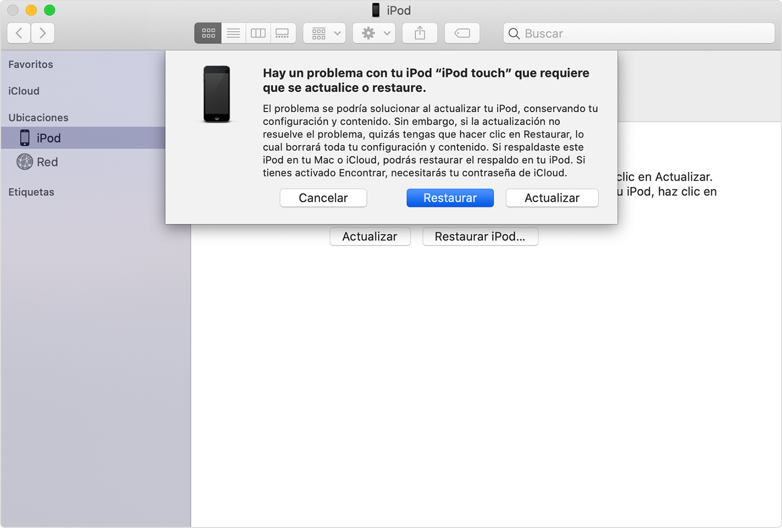1. Busca tu iPod touch en la computadora. Cuando veas la opción de restaurar o actualizar, selecciona Restaurar. El Finder o iTunes descargarán el software en el iPod touch. Si el proceso tarda más de 15 minutos, el iPod touch saldrá del modo de recuperación y deberás seleccionar el modelo del iPod touch arriba para repetir los pasos y eliminar el código.