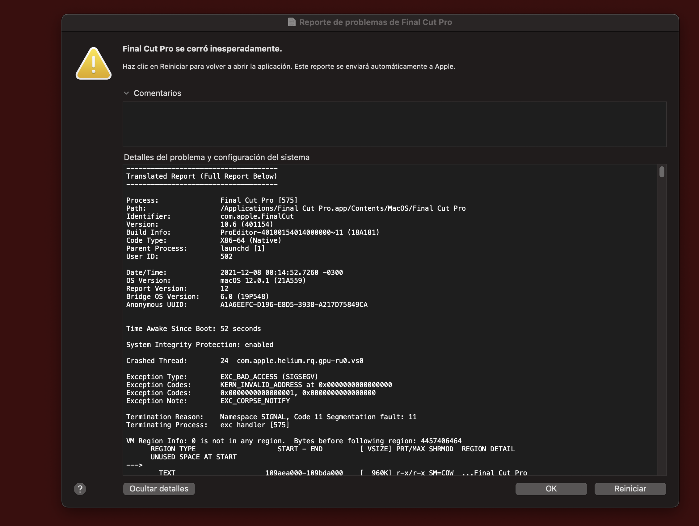 Hola! Me ha pasado lo mismo hace unos días, y lo solucioné ayer por fin. No estoy seguro de si será por el mismo motivo que en el tuyo, pero prueba por si acaso. El problema lo provocaba una o varias fuentes corruptas o dañadas (fuentes de letras, tipografías instaladas). Abría Final Cut y se cerraba a los pocos segundos, o al abrir proyectos diferentes, o al bajar textos, con el mensaje de "..se ha cerrado inesperadamente". Vi que aguantaba sin cerrarse si la biblioteca no tenía ningún rótulo de texto en la línea de tiempo del proyecto, pero si añadía uno, adiós. El caso es que abrí un navegador que hacía tiempo que no abría y estaban todas las fuentes cambiadas a lo loco (buscando cualquier cosa en Google), y pensé que pudiera estar relacionado. Restauré a las fuentes que vienen de serie con el sistema (en "Catálogo tipográfico", dentro de Aplicaciones) y vuelve a funcionar todo perfecto.