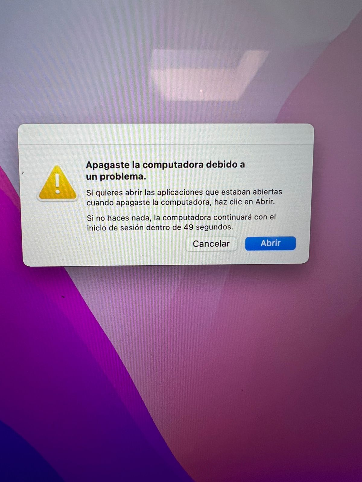 Buenos dias, cuando inicio enciendo mi Macbook Pro me aparece una ventana emergente que dice que hay aplicaciones que se quedaron abiertas antes de apagar mi Mac, quisiera saber como desactivar ese aviso que me sale al inicio ya que llevo 5 días con esa ventana que me aparece solo cuando inicio mi Mac, y quisiera saber como hacer para que me deje de aparecer (dejo la imagen de referencia).